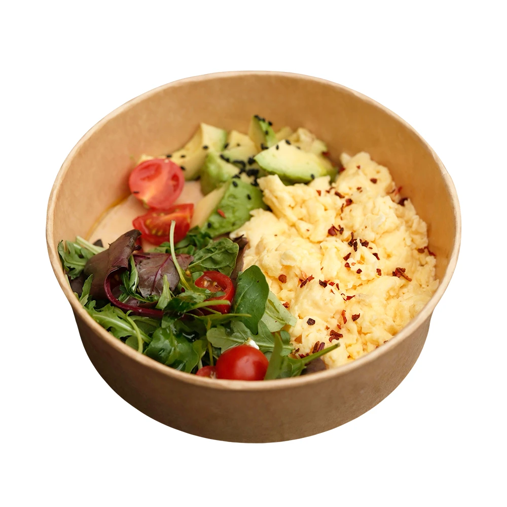 Ніжний яєчний скрембл з креветками, авокадо та помідорами черрі, подається з міксом салату. 340 грам