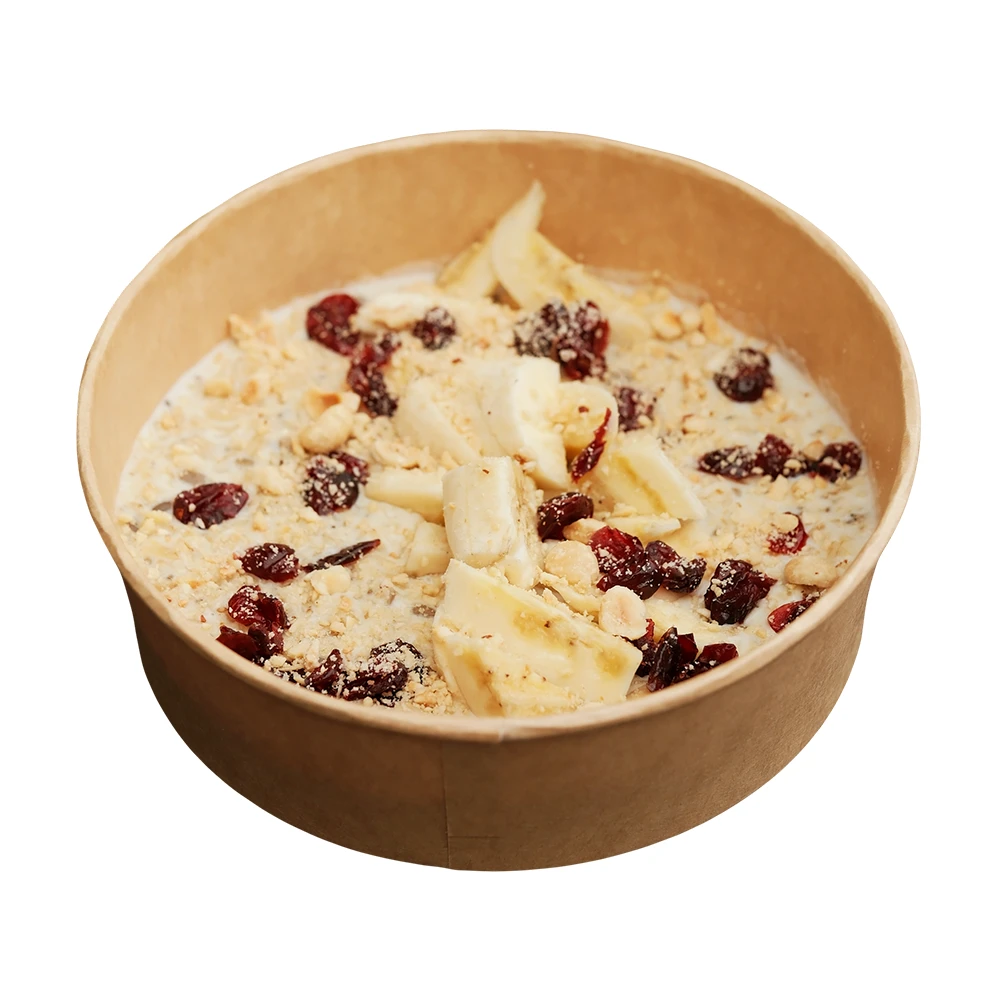 Вівсяна каша на молоці з бананом, горіхами, насінням та сухофруктами.
