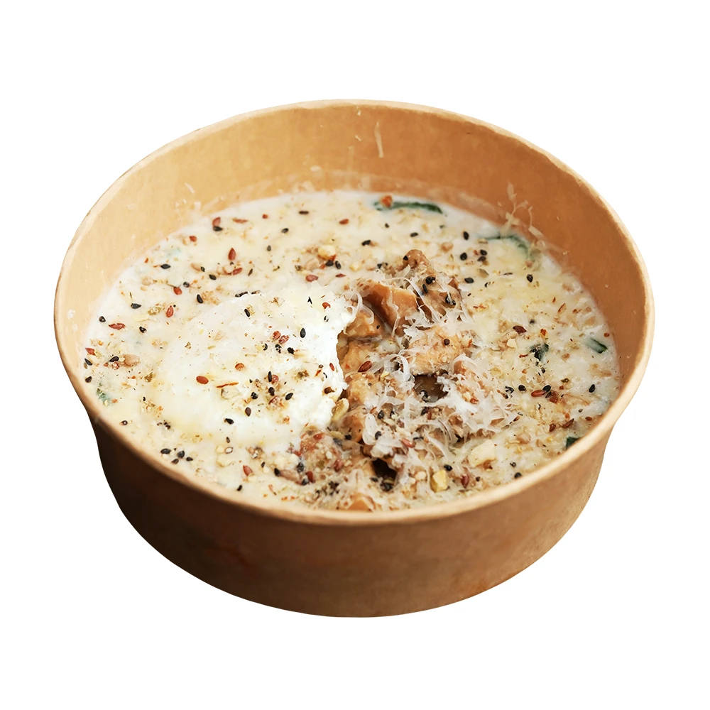 Вівсяна каша на молоці з лісовими грибами, шпинатом, пармезаном та яйцем пашот.