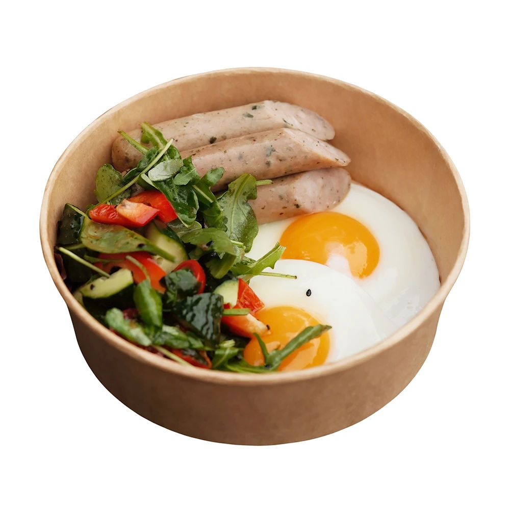 класична яєчня з курячими ковбасками, солодким перцем, черрі, огірком та міксом салату