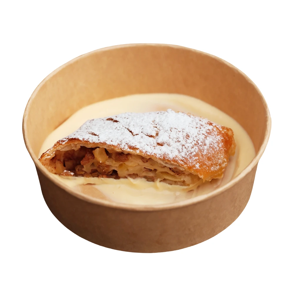 Листкове тісто з яблуками, родзинками та корицею, подається з вершковим соусом